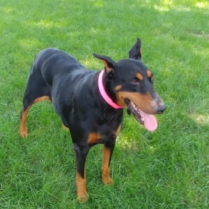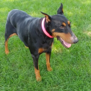 Unfortunately, Daisy has spent a considerable amount of time on her own in the past couple years, primarily outside without heartworm prevention and has tested positive.    She has started her pre-treatment as well as a diet.  Being a bit overweight is taxing on her hips and she has a little difficulty sitting and getting up.  She does get out there and run and play with her foster sister and is ok on stairs.  In typical dobie fashion Daisy wants to be with her people no matter where they go in the house, so you may hear a slight whine if she can’t find you.  She does great in the car and on leash so you can take her along with you too.