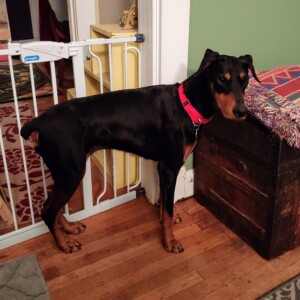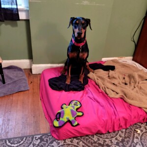 This adorable petite Doberman is Miranda. Born 10/17/17 in Mexico and when she came to live in the US she was left outside in a pen with little socialization with people. This has made Miranda a bit skittish around people but she is trying hard to learn to trust. Never any aggression just fearful and will freeze up. But she is overcoming this every day with all the new people she is encountering.