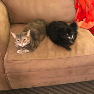3/31/18: Just wanted to share a big moment in our house! Penny has gotten very comfortable getting on our couch these days, even with our dog on the other end. Last week, my dog was on one end of the couch with me, and Penny was on the other end. My dog carefully & sheepishly made her way over to Penny, and sat down right next to her! Penny didn’t hiss or move! We love watching as Penny really comes into her own here. Our only problem with her is that she wakes up at 4:05AM sharp, ready to play, meowing very loudly! haha. A small price to pay for such a wonderful part of our family.