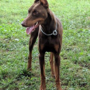 Meet Ozzy! This sweet and spunky 9 month old doberpup would be a happy addition to almost any home. He wakes up ready and willing to give sweet doberkisses. He knows the doberlean very well, when you rub his little head or scratch his ears he leans his head into your tummy with gratitude. From his ready to love disposition, you’d never know this happy, social and tender little boy was ever tied to a tree for 5 months of his life. We have found Ozzy to be receptive to any new medium to large sized dog with no fussiness. We have not small dog tested him. One of his favorite things is new friends and he doesn’t meet a stranger. He doesn’t say much with his voice but his sweet expressive face lets you know exactly what he is thinking and most of the time he has that tell-tale eager dobersmile. This polite little soul gives the right of way to our 2 year old male Doberman & plays with anyone he encounters. He does appear to take social queues pretty well so when they are done and a pup tells him to back off then he does. Ozzy has not been tested with soft toys but he loves bones and kong type toys. He sleeps in a crate because he is still learning bathroom etiquette but he is a quick study. He isn’t excited about the crate but doesn’t complain about being in one. We have not kid or cat tested him. If you’re looking for a spot of sunshine in your day then you should consider adding this lovely little non-human person to your pack!