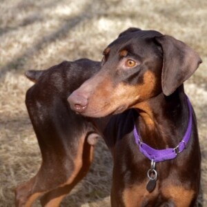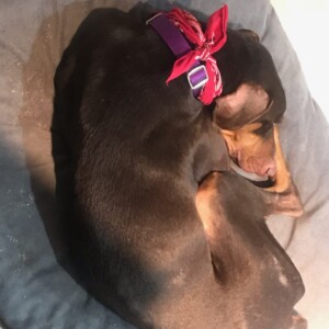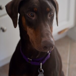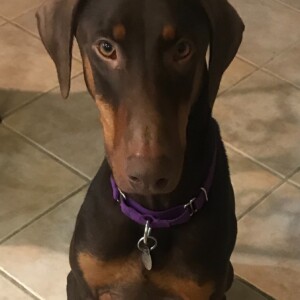 This bright eyed one year old red boy will melt your heart with his cuddles. Dewey is a little more Velcro than the typical Doberman as he is deaf, he uses his sight of you for comfort. He is doing exceptionally well learning the signs for sit, stay and paw. He is potty trained, crate trained, does will with older children but needs work on a leash and has not been cat tested. Dewey gets along wit other dogs when properly introduced but would be best in a home without another male dog.