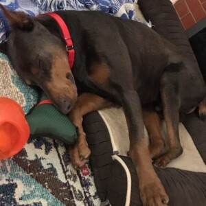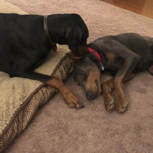 Perry was patient and loving with the rambunctious and bossy 14lb mix breed puppy in his foster home. He allowed her to play with him, borrow his bones and wake him up at all hours and never showed agression, just affection! He is also doing well with larger dogs, including a female dobe in his new foster home.