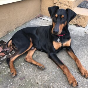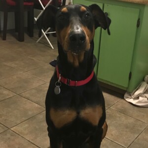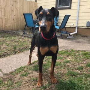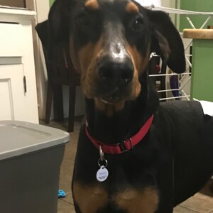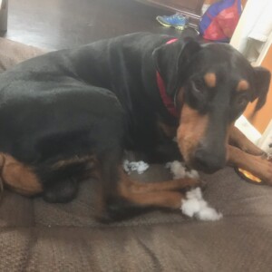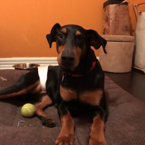 Atticus loves tennis balls & a Gorilla chew.  He sits nicely to be loved on & will continue to love on you for hours.  He is likely 1-2 years old, still somewhat puppyish in behaviors.  He is crate trained & responds to voice commands (“come”, “sit”).  He still needs some training on how to be gentle & reminders to pee outside the house.  His big deep bark is great to remind people that your house is well-guarded.