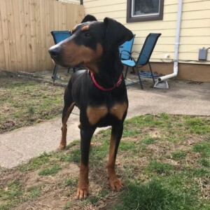 Atticus was found as a stray in South Carolina & made his way to Louisville in January.  He is heartworm positive but will complete treatment at the end of March.  Due to heartworms, he is currently resting & does very well in his crate.  Once he is allowed to, he would love to play with other dogs, large & small.  He currently lives with a miniature dachshund & willingly shares chew toys & crate space with the much smaller dog.