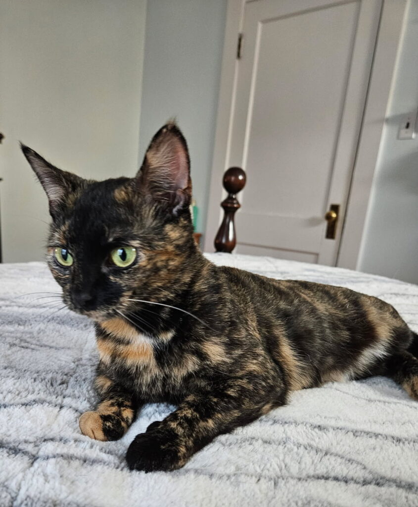 This stunning tortoiseshell beauty is about 1 year old, spayed, microchipped, fully vaccinated, and ready for her forever home.