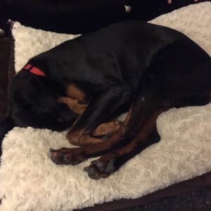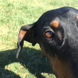 Charlotte is a super cute, petite Dober girl with wonderfully expressive large, floppy, natural ears and a docked tail who is currently being fostered through Doberman Underground in the Cincinnati area. She is about 3-4 years old and came to rescue as part a court case. She came with multiple physical scars all over her body. With good care and nutrition in her foster home, she has grown a beautiful thick black coat that covers many of these scars that still lie under the surface. However, the ones still more obvious are her emotional scars. With previously minimal socialization, she did not learn to trust people and many household basics were (and some still are) novelties to her. She is crate trained and will need to be crated when left alone so as to not get into trouble trying to discover all of those new household items on her own (for example, the fun of chewing up a new pack of toilet paper). She is not an “out of the box” girl and will need a little patience in her new home to learn to trust someone new. For this reason, she would not do well in a home with young children as it’s too much stimulation and excitement for her (she is not child aggressive and may be fine with occasional visiting children who understand and respect her boundaries). Once she learns to trust her adult humans though, she is an absolute love bug! Her true Dobe personality comes out and she LOVES to have her ears and belly rubbed or a good hiney scratching and she’ll cuddle up on the couch with you. Char also love, love, loves her bed! For a little girl who never had her own bed, it is now her “go to” place for relaxing and getting away from too much stimulation. This sweet girl does not need an excessive amount of exercise but will need to continue to work on her leash skills and basic obedience training. She is house trained and does well with treat motivation to continue this…and treat motivation works for many other things as well in this very food-motivated girl! Char requires a physical fence in her new home and will probably be best with at least 1 other dobe to help with her confidence–though she’s not quite learned how to “play” despite attempts from other dogs in her foster home. She is also cat friendly. If you have a little patience, this absolutely adorable little girl will return ALL of the affection you give her and then some!