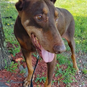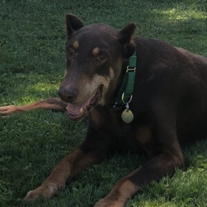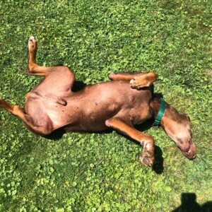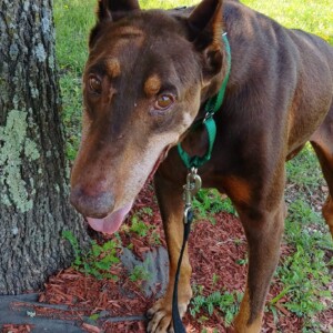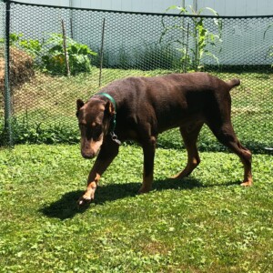 All too often we discard things when they are not as new or not as purposeful as they once were and replace them. Unfortunately some believe that this concept is applicable to man’s best friend. Elmer’s story is the result. At 9 years of age he was relinquished by his owner. Upon arrival this gentle soul was in rough shape. He is heartworm positive and has some abnormalities with his bloodwork results. He has an old break in his back left leg and some left over buckshot in his side. This guy has proven he is a survivor! None of those situations or conditions have touched his soul though. This ole’ boy is so loving and attentive. All he wants to do is snuggle near you and place a paw on you to let you know he is there. Between that look from his loving eyes and the touch of his paw you can almost hear him say “Thank you for taking a moment out of your day to show me I matter.” This old dog has some crafty little tricks up his sleeve for tugging on your heartstrings. We have noticed that the more he resides in a stable environment the more he is opening up and releasing his personality. He cannot yet run and he cannot yet “play” but he does the most with what he can do. He currently has 3 humans and 3 fellow Dobermans to interact with and he makes the most of it. A week into foster and he is rolling on his back in the grass, performing the all too familiar Doberman front leg play stomp, following his foster family around until attention is focused on him, and maybe most importantly he is wagging that nub of his with every interaction.