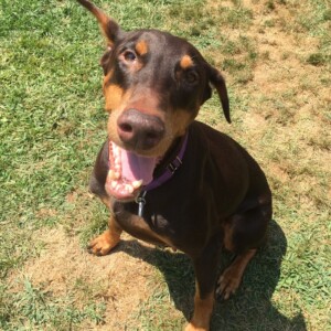 What runs like a Cheetah? Leaps like a Gazelle? As strong as an Ox? As smart as a…..well, as smart as a Doberman! This girl, that’s who. This is Juniper, or “Juni” for short. When this girl gets going, trust me that Juni is all the syllables that you will have time to say! Juniper is a pure bundle of energy and that is very surprising in that we believe her to be around 5 years of age. Not much is known about her history. We know she is a red and rust female, though she is a very dark red, who was found stray in Tennessee. She likely had litter(s) prior to her arrival with us and she was heartworm positive as well as malnourished. Fortunately she is in great physical condition otherwise and those ailments are being rectified. She is steadily gaining weight, her skin and coat are recovering nicely, and she is taking the HW treatment very well.