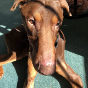 Do you like waking up to wet Doberman kisses and ready to start playing as soon as the alarm goes off? Well. Lincoln hopes that you’re an early riser, just like he is! This pocket-sized Doberman Pinscher is around a year old and enjoys being with his peeps all day long, whether you’re brushing your teeth, cleaning the garage, making a pizza run or watching The Tonight Show. He’ll also follow you from room to room and assist in dish washing (cleaning plates) and help with the laundry (unfolding it).