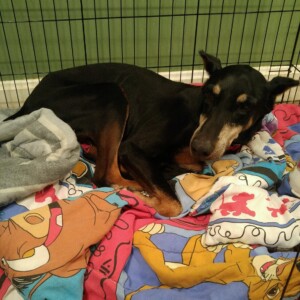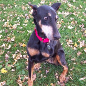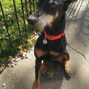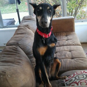 Loves all the people she has met, has the typical Doberman lean when you pet her. Louise is crate trained and house trained but you do have to watch for her subtle signs that she needs to go outside. For being an outside dog her whole life she has adjusted to being an inside dog very quickly.