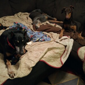 About 3 years ago Louise had her front leg amputated but she gets around just fine. Can still get into dobie mischief if she so chooses!