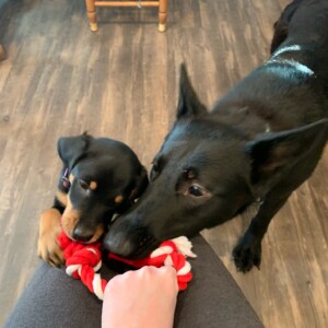 She is a confident little girl, loves to play with all sizes of dogs and is not intimidated by a bigger dog. Mabel is respectful of larger dogs, so if she gets a correction she takes the hint.