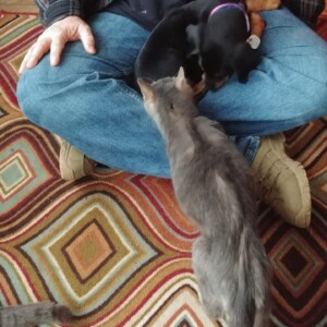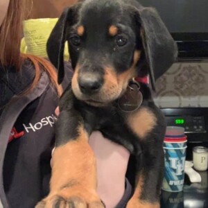 Mabel is crate trained and doing great with her house training. She loves to play chase with her human foster brother. Mabel is good around cats and does not jump on them like a lot of puppies like to do.