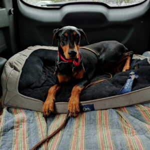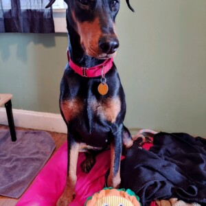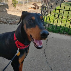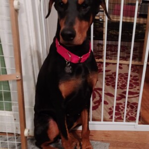 This adorable petite Doberman is Miranda. Born 10/17/17 in Mexico and when she came to live in the US she was left outside in a pen with little socialization with people. This has made Miranda a bit skittish around people but she is trying hard to learn to trust. Never any aggression just fearful and will freeze up. But she is overcoming this every day with all the new people she is encountering.