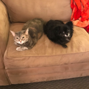 3/31/18: Just wanted to share a big moment in our house! Penny has gotten very comfortable getting on our couch these days, even with our dog on the other end. Last week, my dog was on one end of the couch with me, and Penny was on the other end. My dog carefully & sheepishly made her way over to Penny, and sat down right next to her! Penny didn’t hiss or move! We love watching as Penny really comes into her own here. Our only problem with her is that she wakes up at 4:05AM sharp, ready to play, meowing very loudly! haha. A small price to pay for such a wonderful part of our family.