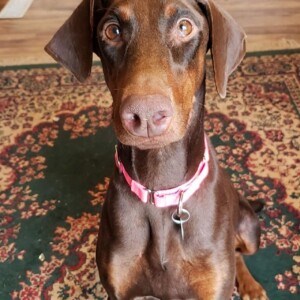 Miss Priscilla was found on a road as a stray, presumably dumped after she was of no use to a BYB. Thankfully, she fell into the hands of a couple that are doberman lovers. After scavenging for nearly 2 weeks, Miss P finally let her future first “doberdad” feed her and carry her to a crate. She was shy of other dogs at first, but with time, love and patience she grew to learn that they only wanted to play with her! Balls to chase and bones to chew are Priscilla’s absolute favorite! Chasing whoever has the ball is a fun game for her too. Priscilla hasn’t been around small dogs, but loves her doberman and pitbull foster siblings without any issues. She hasn’t been around any children either, but loves anyone who will lend her an ear scratch. She is unsure of cats and their intentions, so she would fit best into a home without cats. Miss Priscilla is about 2-3 years old and your typical dobie who loves attention, a constant scratch, a warm bed to sleep on and a bone to chew. She is crate trained, heartworm negative, spayed and UTD on all shots.