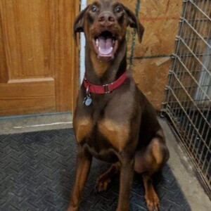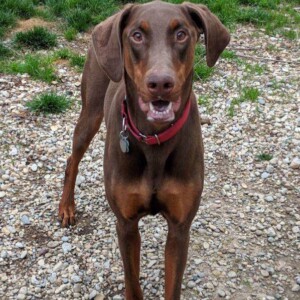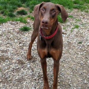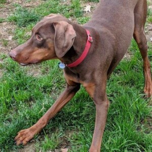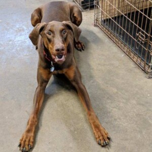Ramsey is an energetic young dobie boy that is looking for a family to help him learn how to direct his never ending energy in the right way. Super sweet loves people, even though his original owners let him down.  He was kept outside chained to a tree most of the time.  They thought he didn’t need to be inside. Ramsey is 2 years old and is house and crate trained.  He loves to play with other dogs but can be a bit pushy so a household with a female dog his size will be best.  Or he wouldn’t mind being an only dog so he can have all the attention for himself! He has met kitties and ok with them but if they run they will be fun to chase. Ramsey loves to play ball and would enjoy having a family to show him some other fun games.  Because he is a big puppy himself and doesn’t know boundaries young children will not be best for Ramsey.