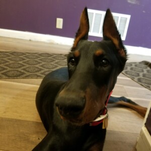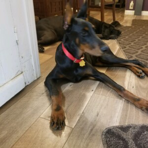 A typical dobie puppy, sweet silly and into as much mischief as he can find, but he is a quick learner and will listen when given proper direction.
